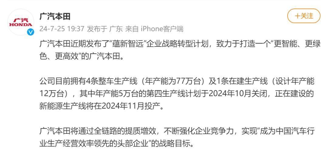 在本田中国官宣以前,7月25日,广汽本田方面已公开其工厂关停一事。广汽本田方面表示,公司近期发布了“蕴新智远”企业战略转型计划,目前拥有4条整车生产线(年产能为77万台)及1条在建生产线(设计年产能12万台),其中年产能5万台的第四生产线计划于2024年10月关闭,正在建设的新能源生产线将在2024年11月投产。